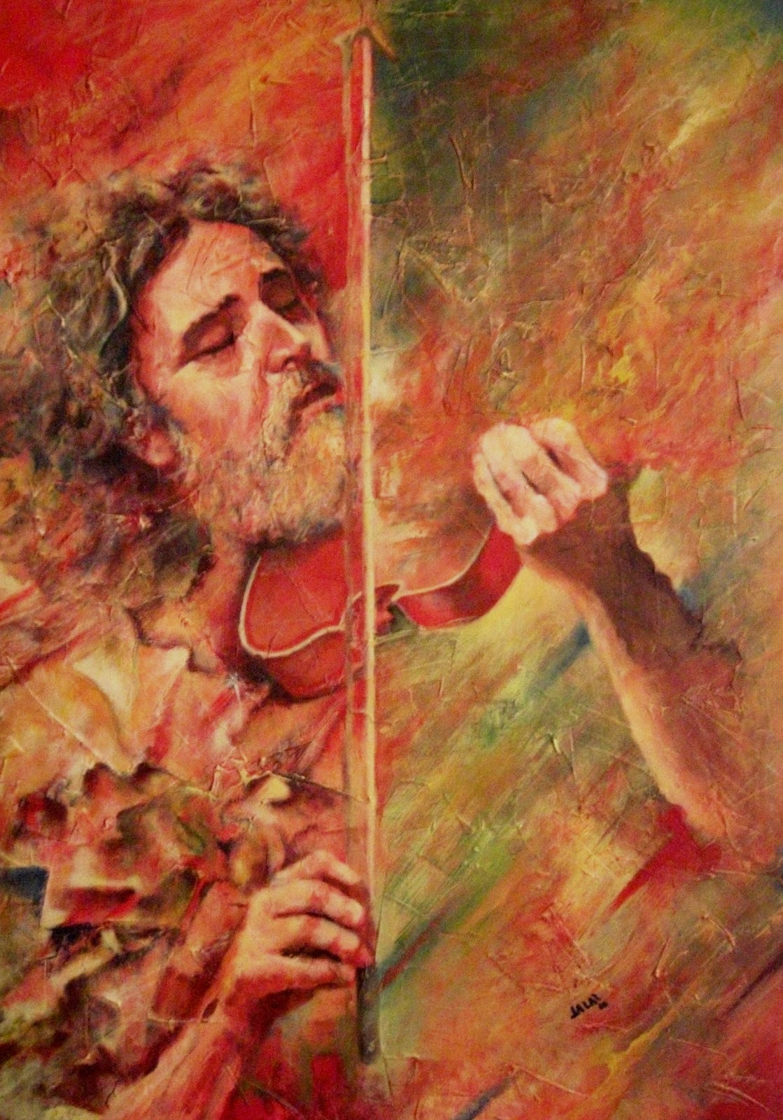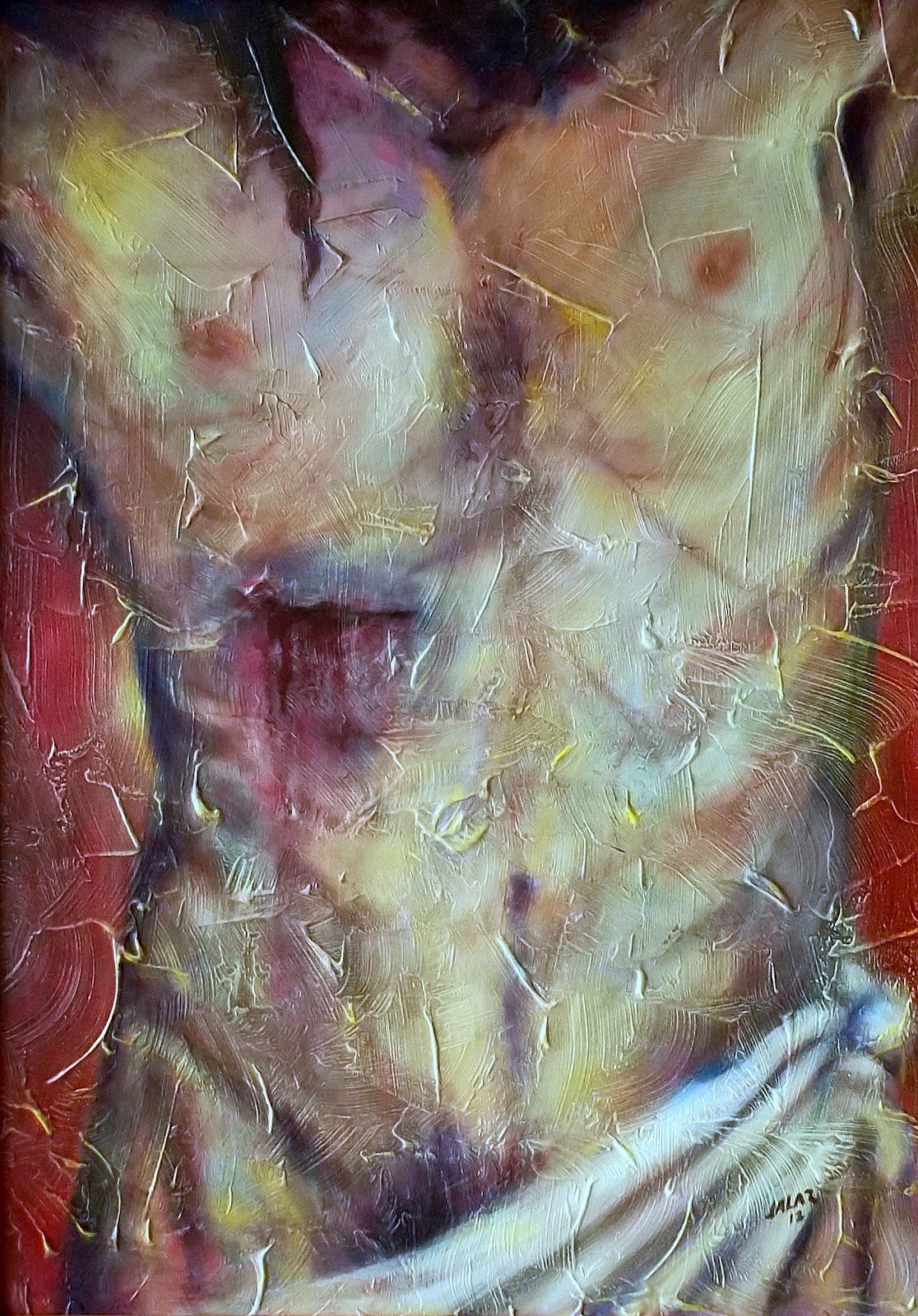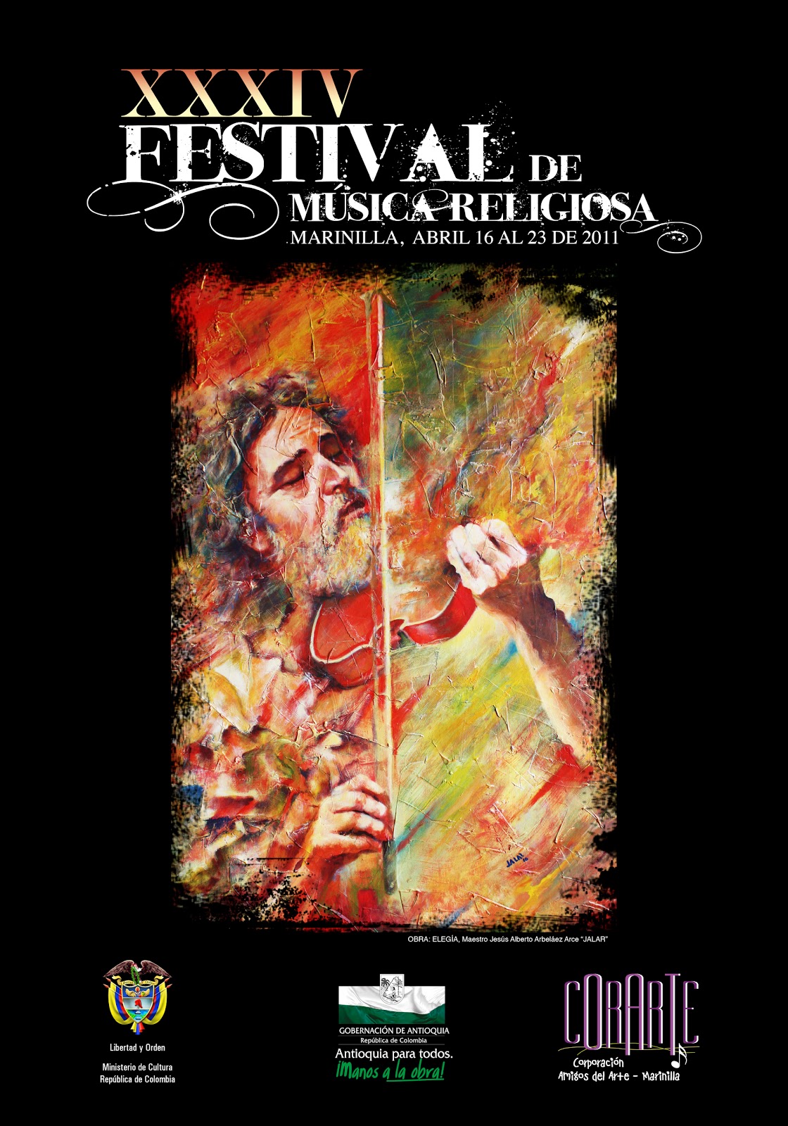 No obstante inscribirse su obra bajo la tendencia surrealista, Jesús Alberto Arbeláez Arce, JALAR, no se ha ligado definitiva o exclusivamente a ella, por una sencilla razón: su propia introspección, paralela a su mirada del mundo y de la vida bajo el común denominador de una profunda sensibilidad, no le ha permitido –ni le ha interesado– desligarse de los problemas –y búsqueda de soluciones– que en su trayectoria le han planteado tanto la realidad social (su pueblo, la provincia, el orbe) como su trabajo pictórico. Ello explica, por ejemplo, la naturaleza de sus exposiciones anteriores; algunas, de carácter temático (Más allá de la madera, Resplandores…), y otras, generales y comprehensivas de su multifacética expresión (Fragmentos…), tanto en eventos de carácter individual como colectivo. Y también explica o hace comprensible su actitud, especialmente reflejada en el conjunto de su obra, en la que (aun siendo capaz de plasmar, con creces –en el lienzo o en la madera o hasta en inverosímiles materiales que a veces encuentra en su camino–, la belleza de los objetos o los detalles cotidianos) sobresale su inconformidad, su rebeldía, su grito, que en realidad es el grito y el clamor de una humanidad compuesta por millones de seres que tienen –tenemos– tanto en común. El dolor, la estupefacción que no podemos soslayar, el amor mismo y antes y después la belleza que proporciona esperanza, permean aquellos materiales que, con su paleta, sus pinceles y sus espátulas, JALAR va convirtiendo en arte. Pero, insisto, el desgarramiento, el desarraigo, el estremecimiento constante y el estado absorto ante la degradación e indecencia de esa especie que se ha autoproclamado la reina y heredera de la tierra, ¡a más de la zona rosa –si se me permite el término– de su trabajo pictórico, por supuesto!, pueblan la obra de JALAR, como presencias hieráticas, inamovibles e inconmovibles al lado de todas las formas de oprobio, como relámpagos kafkianos que hieren las entrañas, como efusiones sanguinolentas de cuerpos que jamás se terminan de contar mientras víctimas y victimarios enceguecen ante extraños resplandores: aquí el rojo jalariano se funde con el amarillo de su eterna experimentación, y, mientras nos regala su mensaje, continúa deleitándose, con alegría sin límites y con dolor inefable, en lo que ha constituido una de sus mayores pasiones: la búsqueda del color.