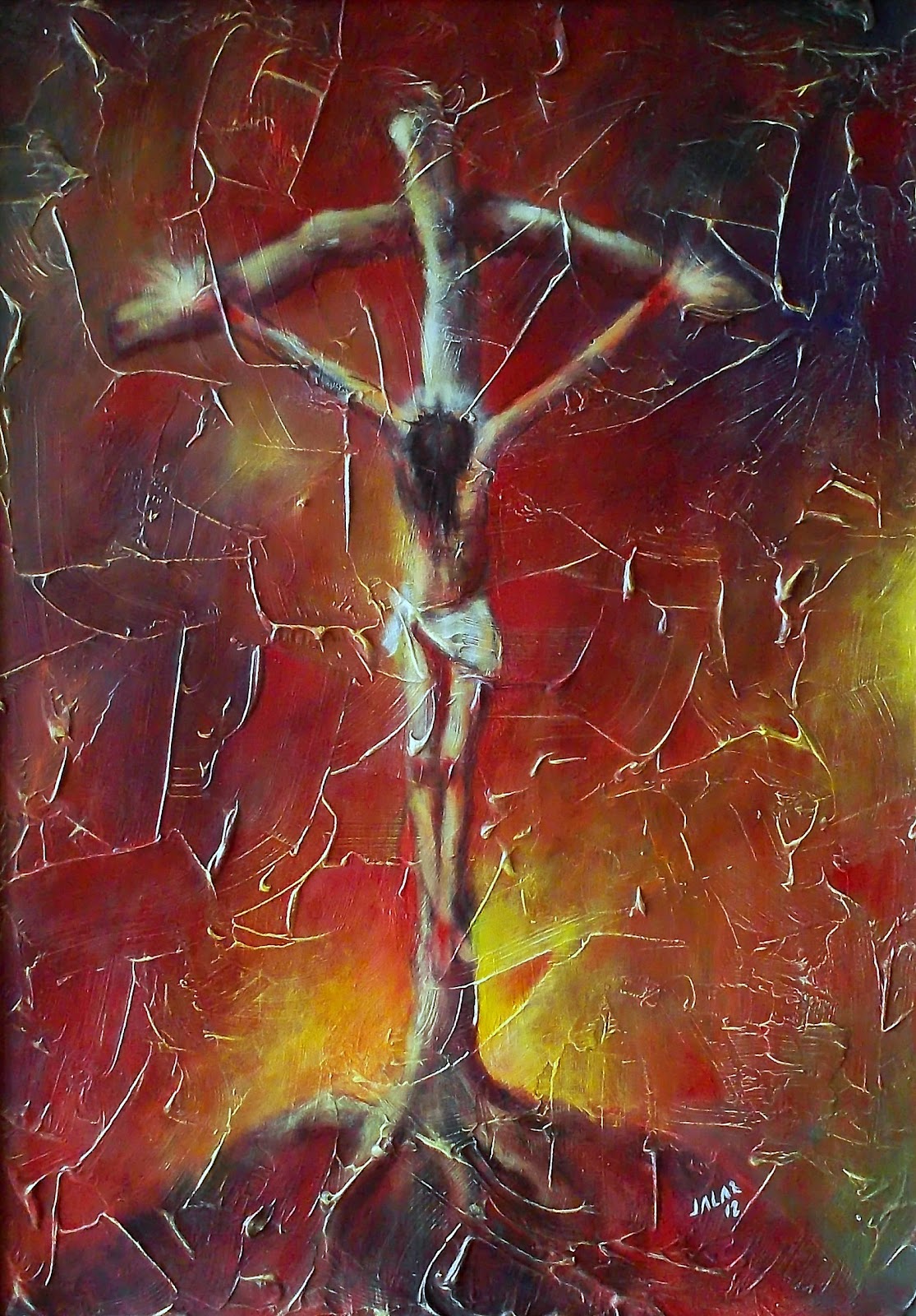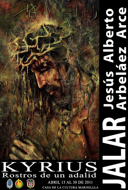 Feliz coincidencia, hablando ahora de JALAR, la de que el arte de la pintura, en sus orígenes, estuvo, más que ligado, supeditado al sentimiento –y al interés– religioso. Sabemos lo que significa Jesucristo para el mundo cristiano, y también sabemos de su importancia en otras religiones; su mensaje de amor y también de rebeldía ante la injusticia, así como el significado de su Presencia, cuyo espejo encuentra en otros hombres que han marcado la historia de la humanidad, interesan, profundamente, a JALAR: ésta es la razón del nombre Kyrius o Kyrios, término de origen griego que significa Señor, y que en la lengua clásica griega se usaba tanto con sentido profano (literal y figurado) como religioso (referido a los dioses, especialmente Zeus). Pero también Kyrios es el título honorífico, que expresa dignidad y autoridad, cuyo destinatario mayor es Cristo resucitado para proclamar su gloria y su soberanía sobre la historia humana y sobre todo el cosmos, lo que ha llevado a JALAR a bautizar así al conjunto de sus últimas obras. En sentido religioso y auténticamente teológico, Kyrios se refiere entonces a Jesús exaltado, Señor de La Iglesia y de la Historia, que algún día vendrá a llevar a cumplimiento su venida a este mundo.